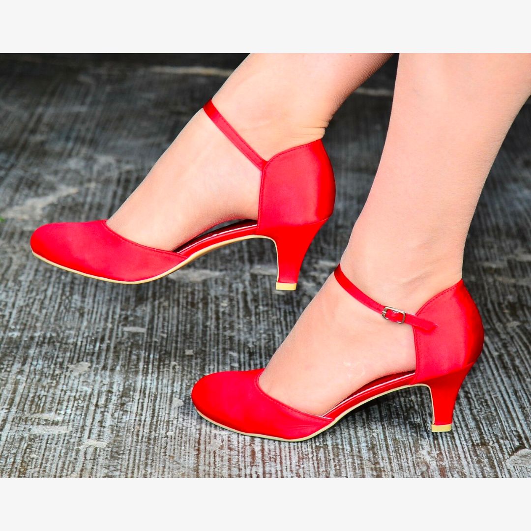 These low 2.5 inch satin kitten heels feature an ankle strap, full toe, and court shoe style, making them perfect for weddings, special occasions, and anytime you want to feel and look stunning while staying comfortable. They are covered in beautiful satin and offer both style and comfort.